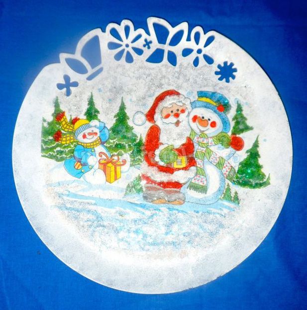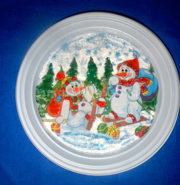 5. Змащуємо тарілочку клеєм ПВА, розведеним з водою(1:1) і приклеюємо картинки.