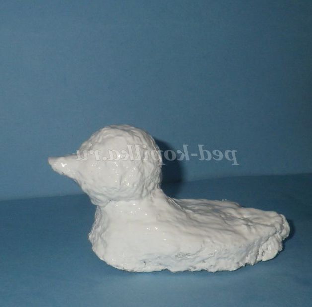 Можна через сито зцідити зайву воду. Додаємо клей ПВА і ретельно перемішуємо. З отриманого тіста ліпимо качечку. Надаємо качечка форму голови, дзьобик, хвіст. Нашу крижня викладаємо на просушку в природних умовах на добу.