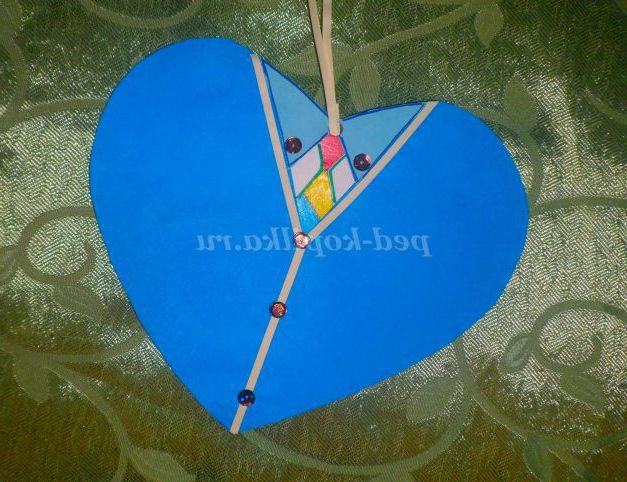 7.У верхній частині сердечка робимо отвір для стрічки. Медаль для дівчинки готова.