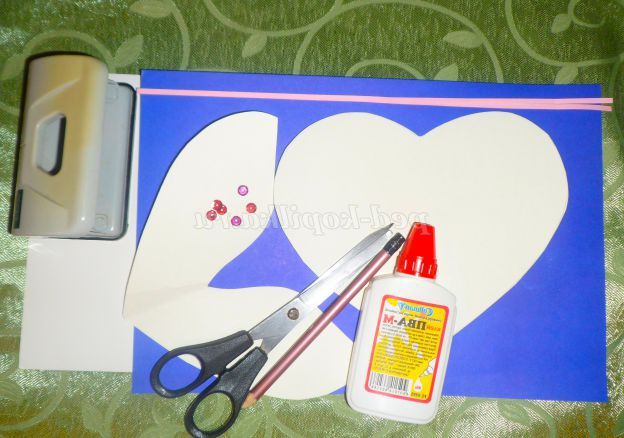 Необхідний матеріал: кольоровий папір, білий картон, готові шаблони, ножиці, клей ПВА, олівець, дирокол, паєтки або гудзики, тасьма