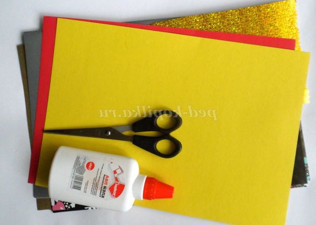 кольоровий папір (сріблястий колір - обов'язково!) , кольоровий картон,жовта фольга, ножиці, клей ПВА, або клей-олівець