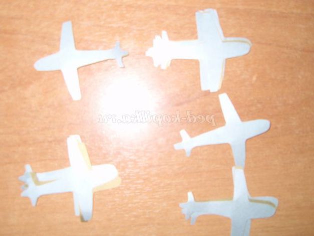 Малюємо на білому картоні силуетні зображення літачків і кораблів , переводимо їх на кольоровий папір і вирізаємо.