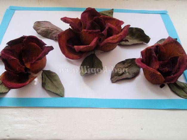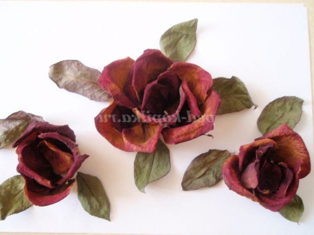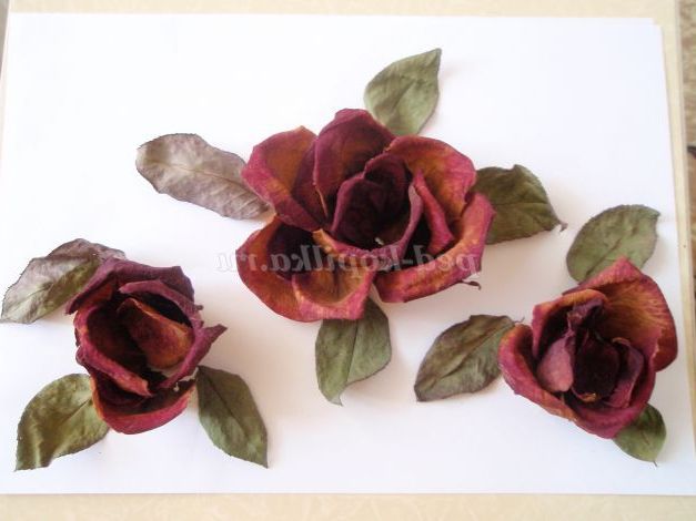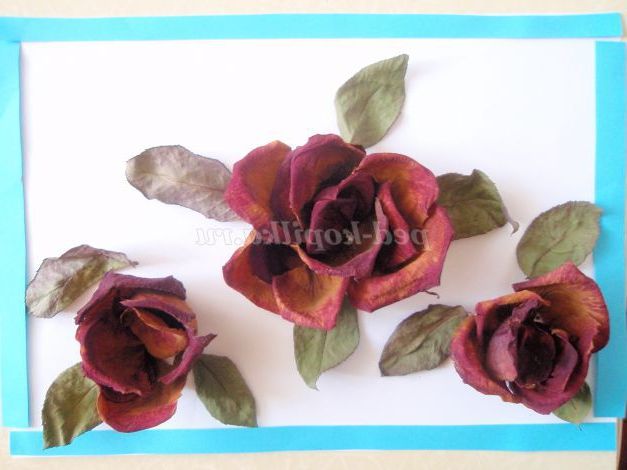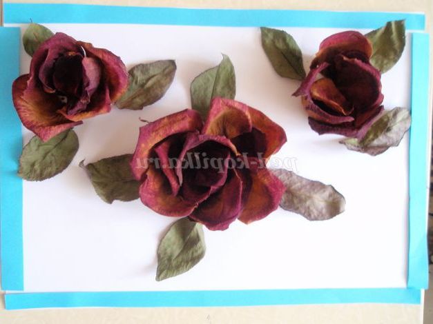Всім ми на свята радіємо подарованим букетів квітів, але радують вони нас не так вже довго, як хотілося б. Будь-які способи ми використовуємо для того, щоб продовжити «життя» своєму букету: часто міняємо воду у вазі, додаємо у воду з квітами різні добавки, щоб квіти довго не вяли, підрізаємо стебла і багато іншого. Але проходить час і наші квіти в'януть. Мені завжди шкода викидати квіти, тому я завжди намагаюся зробити якусь саморобку з використанням кольорів. На цей раз представляю вашій увазі картину і листівку , виготовлену з завядшего букета троянд.
