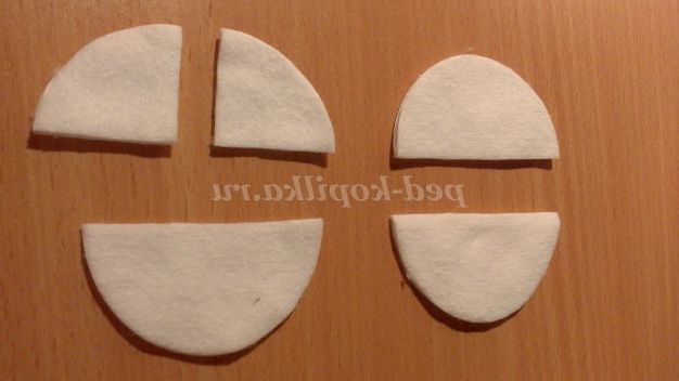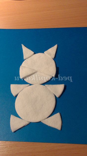 5. Потім приклеюємо передні і задні лапки. Приклеюємо половинку ватного диска - це хвіст.