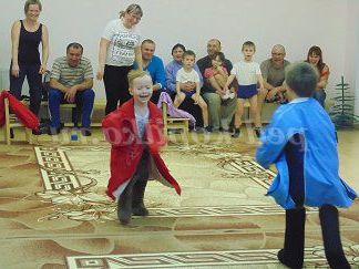 Обладнання: гімнастичні м'ячі з ручкою - 3 шт.; м'ячі великі - 5 шт; кубики - 5 шт.; кубики - 6 шт.; обручі малі - 15 шт.; костюми для переодягання - 2 шт.; валянки - 2 пари; ключки - 5 шт.; дартс - 1 шт., дротики - 6 шт.; кулі - 5 шт.; парасолька - 5 шт.