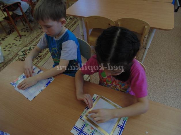 (Вихователь заготовки робить заздалегідь, бо діти це зробити не зможуть. Беремо картон наприклад блакитного кольору і загинаємо його навпіл. У одного квадрата робимо рамку в 1см, креслимо його і вирізаємо. Вийшла основа для рамочки під кальку. Квадрат, який залишається після вирізаною рамки, можна помінятися з іншою дитиною (щоб не збігалися кольори з рамкою).