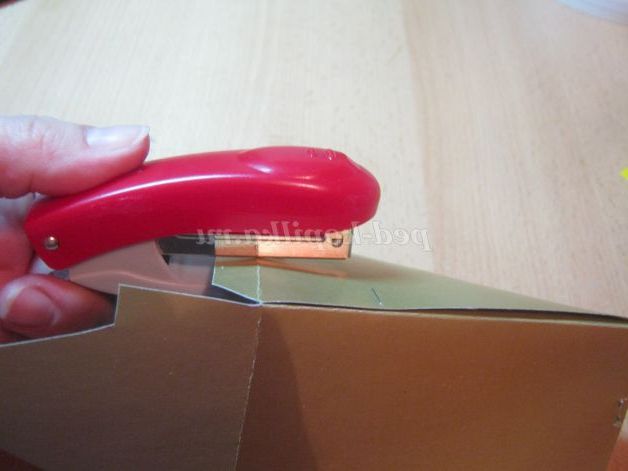 4. З'єднати гострий кінчик і закріпити степлером, з'єднати і закріпити бічній шов.Закрыть коробочку,вставивши клапан в проріз.