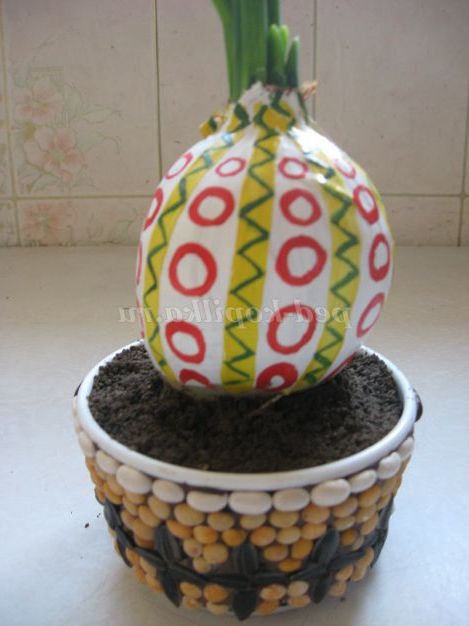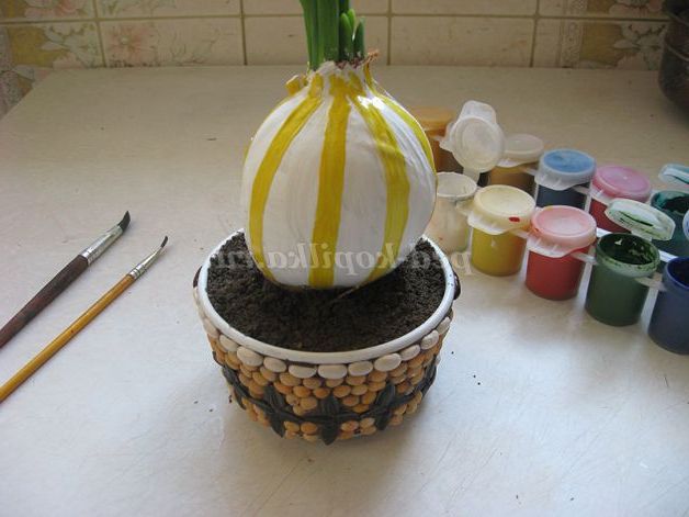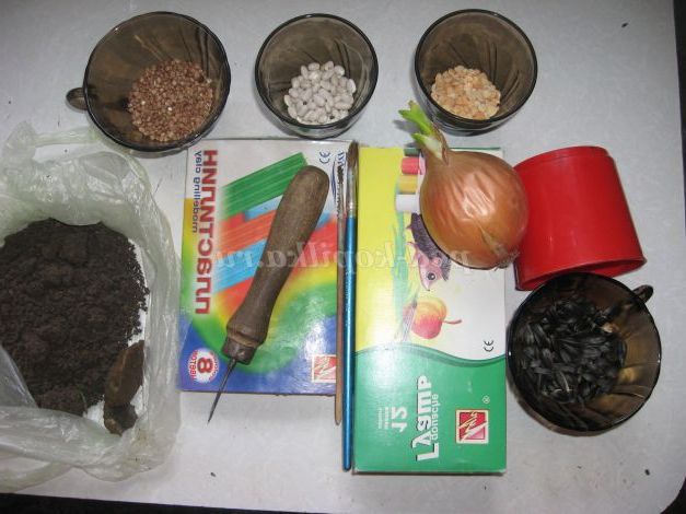 Для роботи нам знадобитися: будь-яка ємність або баночка від йогурту, шило, пластилін, насіння, крупи, кілька камінчиків, земля, велика трохи проросла цибулина, гуаш, пензель, вода.