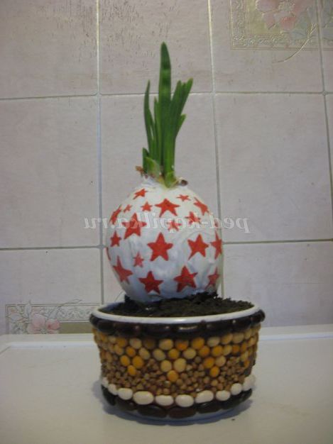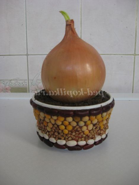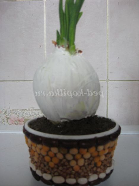 Виберіть велику головку ріпчастої цибулі, посадіть в грунт. Раджу при виборі цибулі віддати перевагу трохи пророслої - це скоротить час вигонки зелені. Якщо Ви робите такі подарунки із діти, то вони із задоволенням виконують обов'язки чергових на «городі», що сприяє розвитку відповідальності. Город на вікні викликає у дітей великий інтерес, є місцем систематичних спостережень, де діти мають можливість проявити активність і самостійність; у них формуються уявлення про рослини, їх потреби, про зростання і розвитку, зміні життя в залежності від сезону, умов.