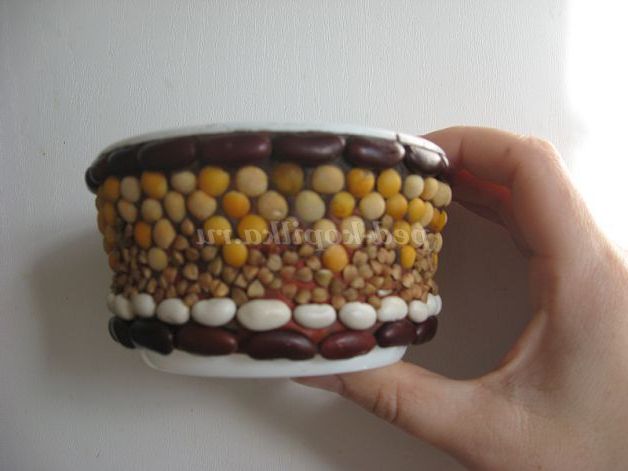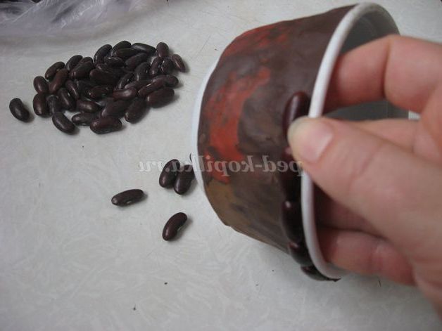 Нанесіть рівномірний шар пластиліну на коробочку. Пластилін буде основою для кріплення насіння, зерен.