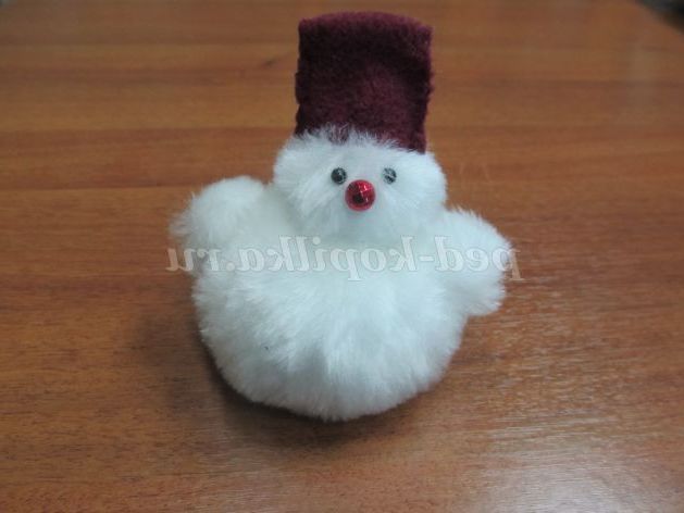 Відро пришиваємо на голову. Приклеюємо очі і ніс з бусинок. Ось Сніговичок готовий.