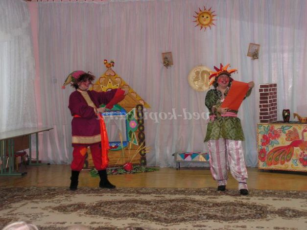 ![]() Масляна в дитячому саду. Старша, підготовча группаМАСЛЕНИЦА. Конспект розваги для дітей старших і підготовчих до школи группЗвучат веселі наспіви. До зали входять діти, сідають на свої місця. Вбігають 2 скомороха.[/