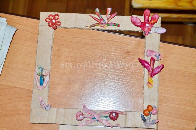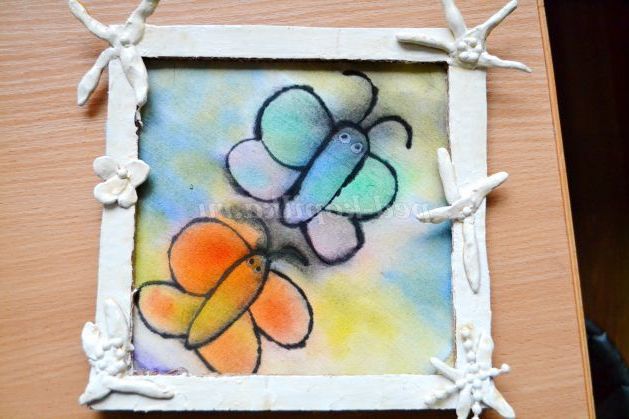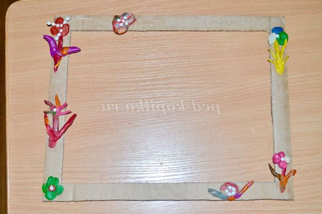 метелика готовий. Приступаємо до виготовлення рамок. На заздалегідь вирізаному картоні під рамочку діти з пластиліну ліплять різні квіти, дерева, кульки, прикріплюючи їх на рамку , додають непридатний матеріал, створюючи таким чином композицію.