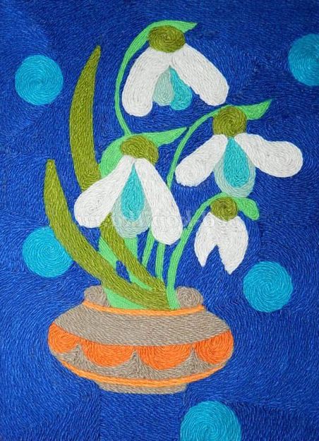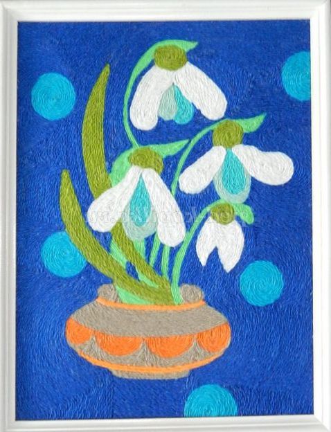 4. На клей викладаємо нитки. «Малюємо» нитками всі елементи, краще від центру формату, до його країв. Там, де кінчається колір, просто обрізаємо нитку ножицями.