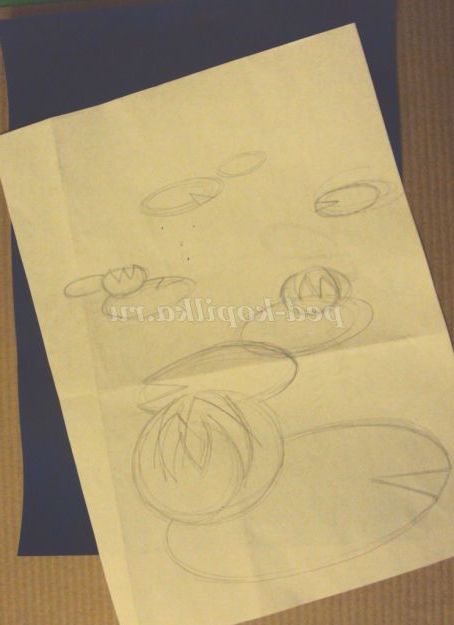 1.Малюємо ескіз на виворітній стороні картону, а можна намалювати на окремому аркуші і накласти зображення зверху.