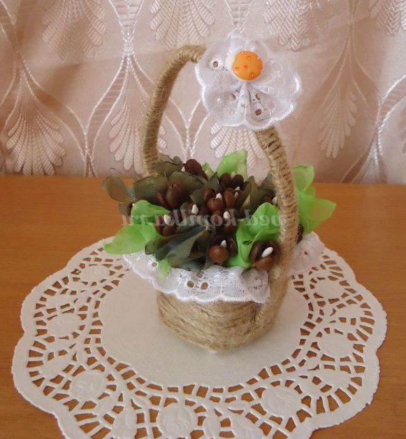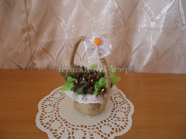 9. етап Приклеюємо ручку. Вставляємо наші кавові квіточки і «фунтики». Прикрашаємо ручку кошика квіточкою з мережива з сонечком.