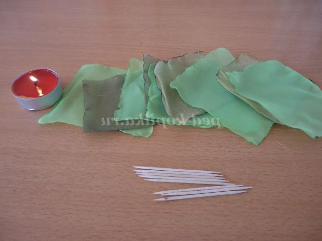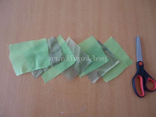 5.етап Беремо зелену тканину органзи і розрізаємо на квадрати зі стороною шириною 6см.