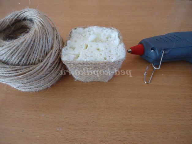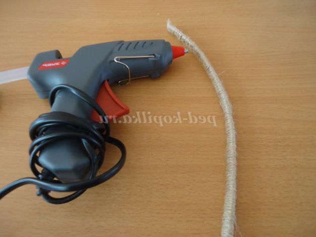 1.1З допомогою термопістолети приклеюємо шпагат навколо заготовки. Отримуємо основу майбутньої кошики.