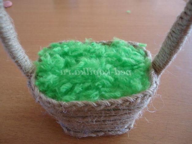 10.этап Можна прикрасити кошик, сплітаючи з шпагату кіски. Викласти зеленими нитками основу під квіти.