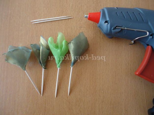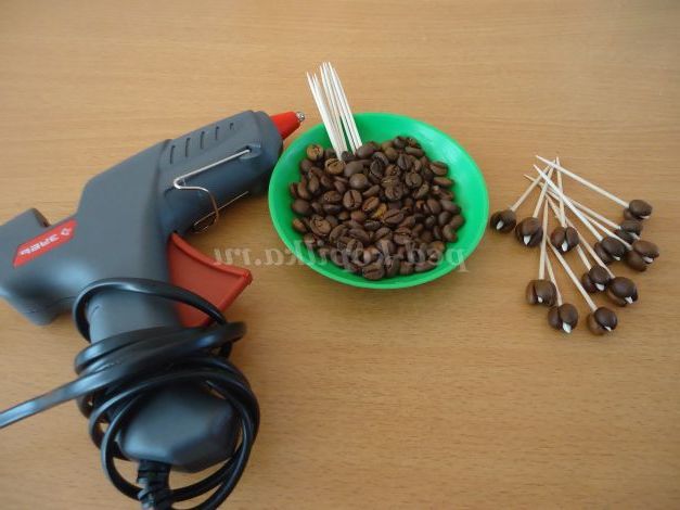 4.этап Потім за допомогою термопістолети приклеюємо кавові зерна до білим сердечникам на зубочистках.