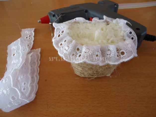 8. етап Оформляємо кошичок. По краю кошика приклеюємо термопістолетом мереживо.