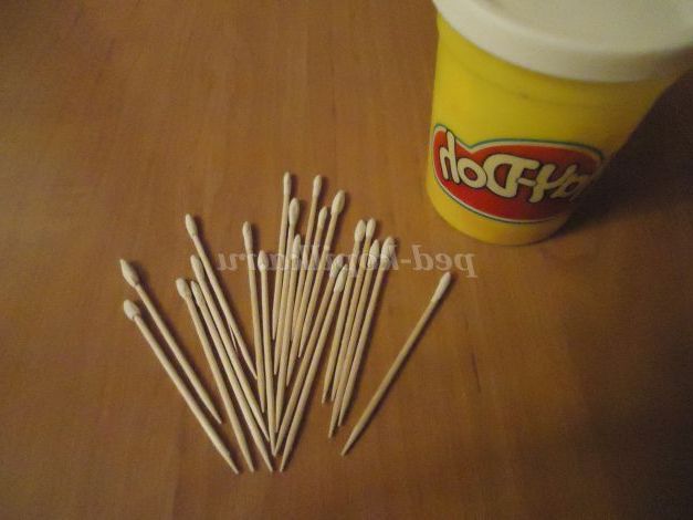 3.етап Використовуючи білу пластилінову масу застигає на повітрі і зубочистки, робимо невеликі наконечники. Отримуємо серцевину квітки. Почекаємо, коли маса застигне.