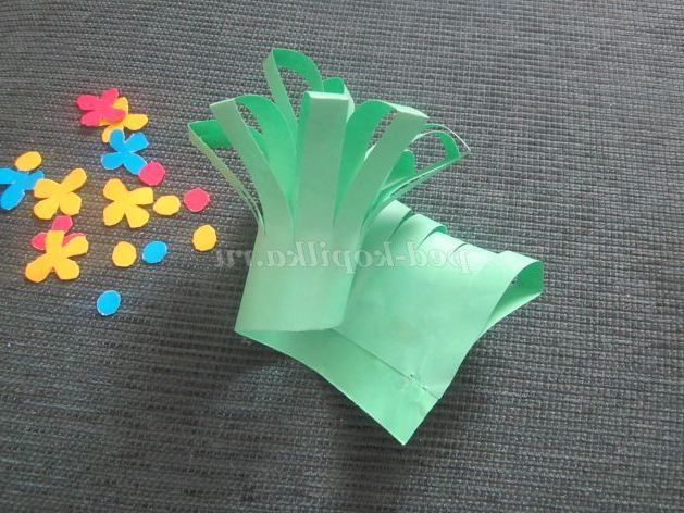 Використовувані матеріали: кольоровий папір для квіточок-заготовок, 0,5 аркуша А4 зеленого кольору, клей, серветка, 10-14 див. тонка стрічка.