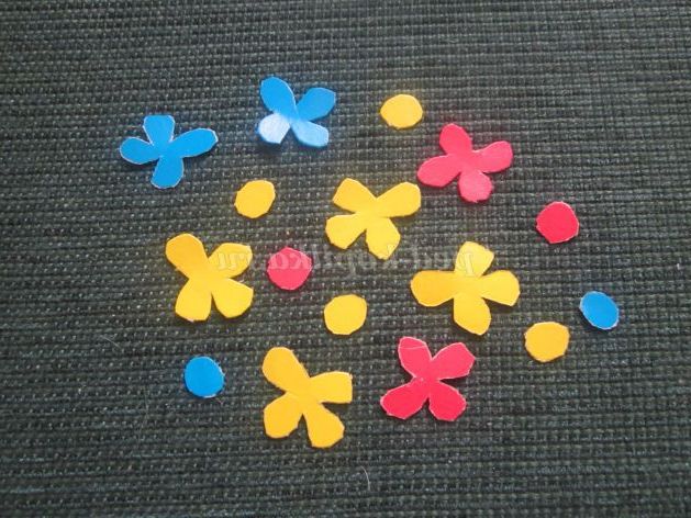 Заздалегідь приготувати квіточки і кружечки (імітація бутонів) різного кольору, діаметром 1-1,3 см. по 10 штук на букетик.
