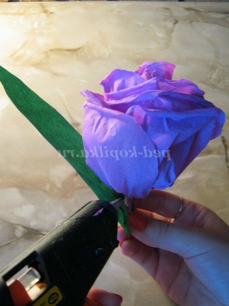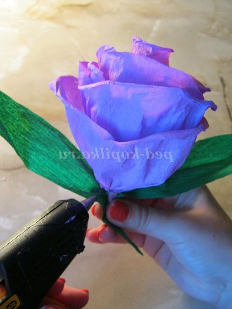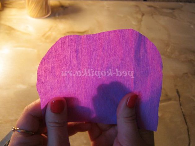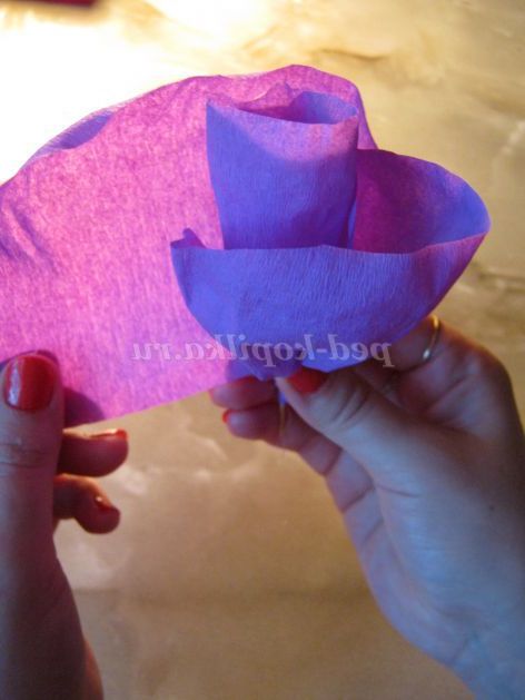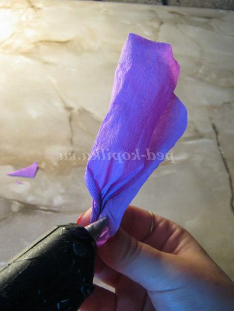 Крок 7. Беремо ще один прямокутник (зрізаємо кінчики кутів зверху, так само розтягуємо папір з одного краю ) і обертаємо наш бутон, проклеюємо з'єднання і зав'язуємо ниткою.