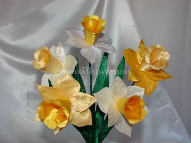 квіти з тканини, нарциси своїми руками, гільйошування, випалювання по тканині