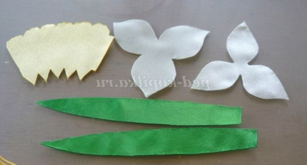 З білого креп-атласу, складеного вдвічі вирізати по одній деталі пелюсток квітки, з жовтого - одну деталь віночка, з зеленого - дві деталі листя і одну деталь чашолистка. Шаблони накласти на тканину і щільно притискаючи його краю вирізати деталі по контуру