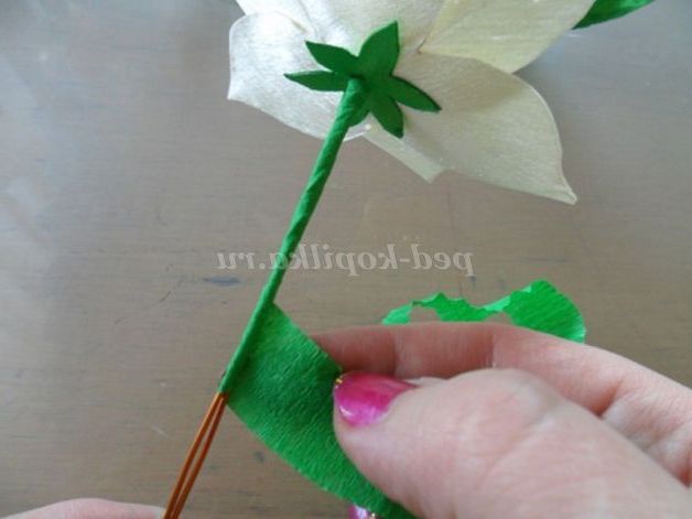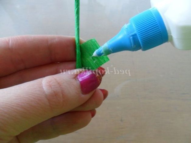 Біля основи квітки фіксуємо смужку гофрованого паперу клеєм ПВА і починаємо обмотувати стебло (при відсутності паперу, стебло можна обмотати нитками «муліне»).
