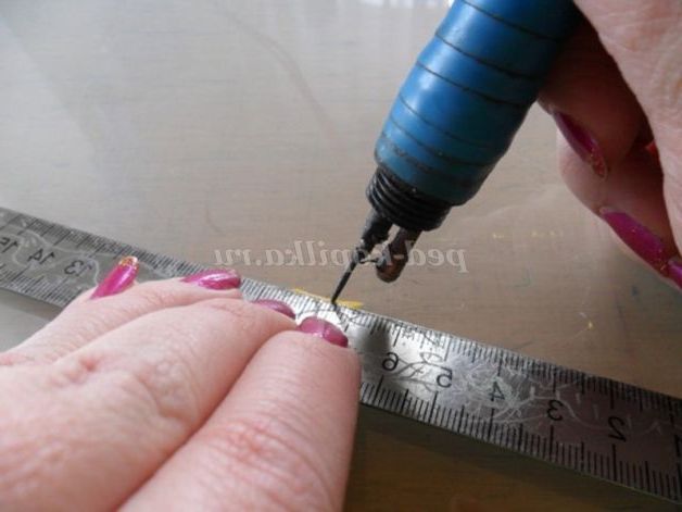 За допомогою випалювача «оживити» пелюстки і листя квітки, нанести прожилки.На листі робимо прожилки таким чином, щоб посередині утворилася "кишеня" для розміщення в ньому дроту.