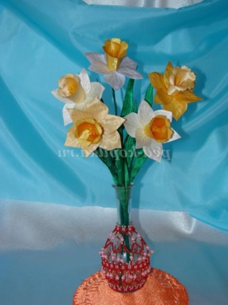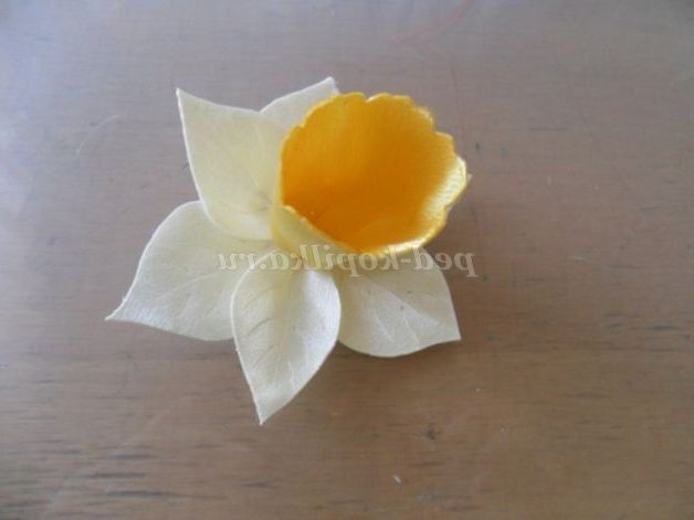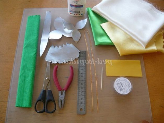 Необхідні матеріали: Тканина креп-атлас білого, жовтого і зеленого кольору, шматочок підкладкової тканини 5х6 див., мідна або алюмінієва дріт для стебла діаметром 2-5 мм, Довжиною 20-25 см, дріт діаметром 0,4-0,6 мм для листів, шаблони деталей квітки з металевої фольги, металева лінійка, клей ПВА, гофрований папір або нитки муліне зеленого кольору.