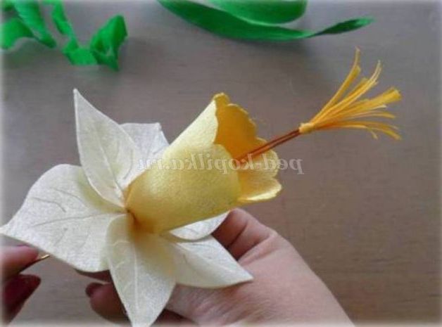 Потім, насадивши віночок квітки на зубочистку або металевий стрижень, споюємо пелюстки і віночок.