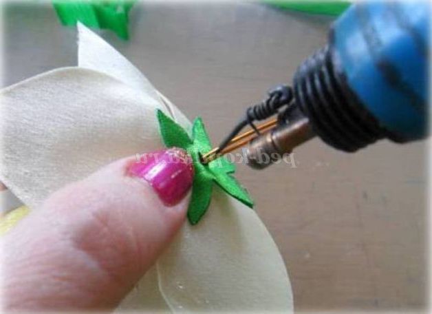 В деталі чашолистка посередині робимо випалювачем отвір і так само надягаємо на стебло, фіксуємо випалювачем.