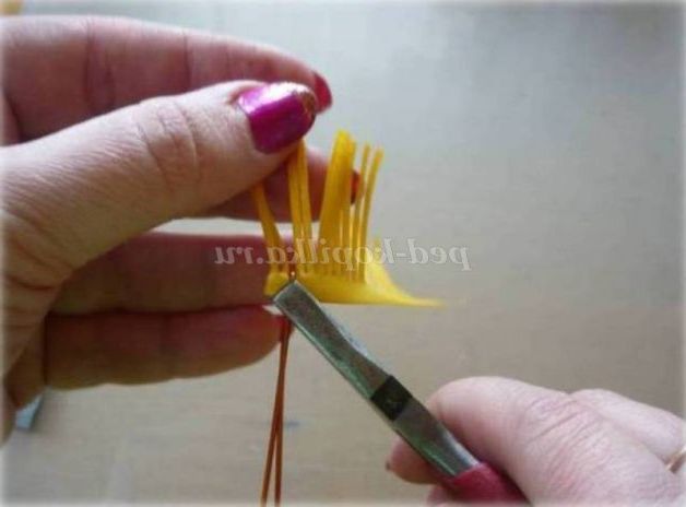 її складаємо навпіл). В утворену петлю вставляємо край нарізаних «тичинок» і затискаємо плоскогубцями.