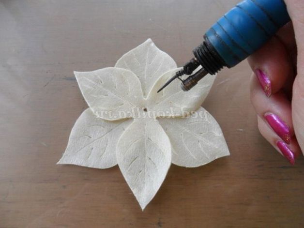 Деталі пелюсток складаємо. Знизу маємо деталь з більш широкими пелюстками. У середині робимо отвір випалювачем діаметром 2-3 мм. В нижній частині віночка також робимо отвір.