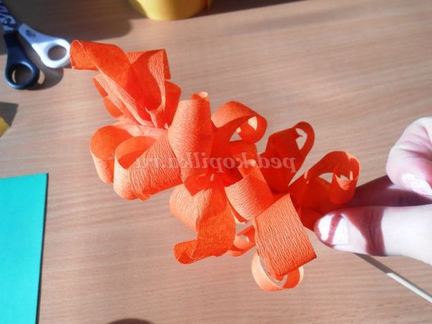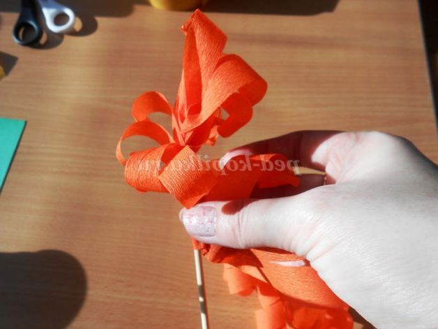 І починаємо акуратно намотувати нашу стрічку з завитків на шпажку, закріпивши верхівку квітки скотчем. Не забуваємо акуратно розправляти наші завиточки
