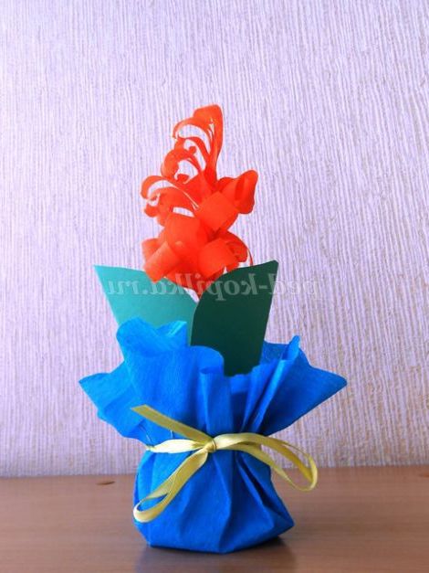 І красиво загортаємо нашу вазу з квіткою в цей папір, закріплюючи її атласною стрічкою. Ось що вийшло!