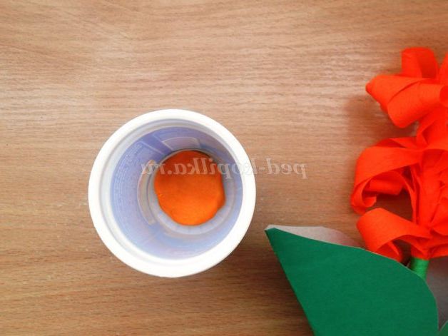 Наш квітка готовий! Залишилося тільки зробити для нього вазу або підставку. Для цього можна взяти стаканчик з-під будь-якого йогурту. Отже, беремо стаканчик і пластилін. Розм'якшений пластилін кріпимо на дно стаканчика і вставляємо наш квітка в стаканчик з пластиліном (пластилін допомагає квітці втриматися на одному місці).