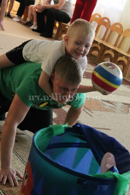 2 Конкурс з татами. «Попади в ціль» Папи рачки везуть дітей на собі до мети а дитина повинна потрапити м'ячем у кошик.