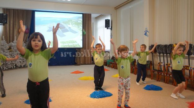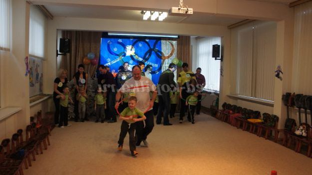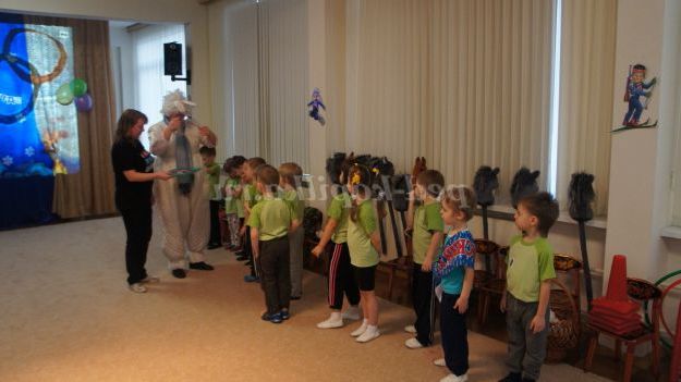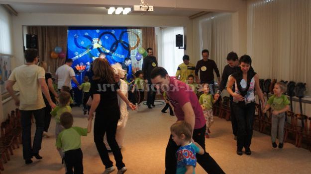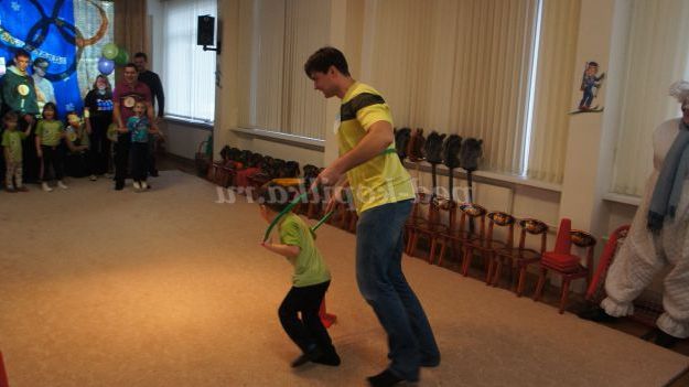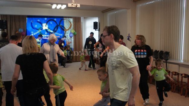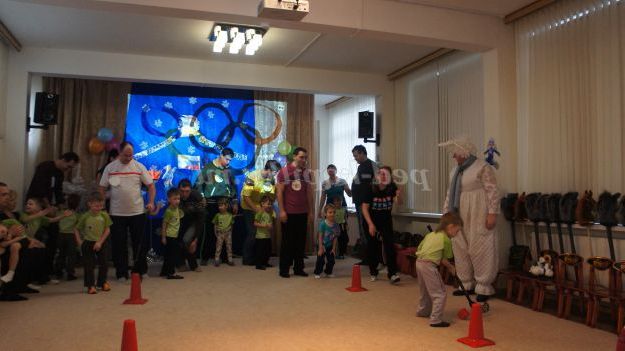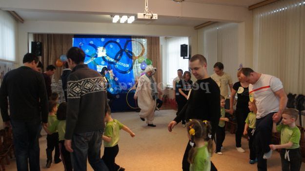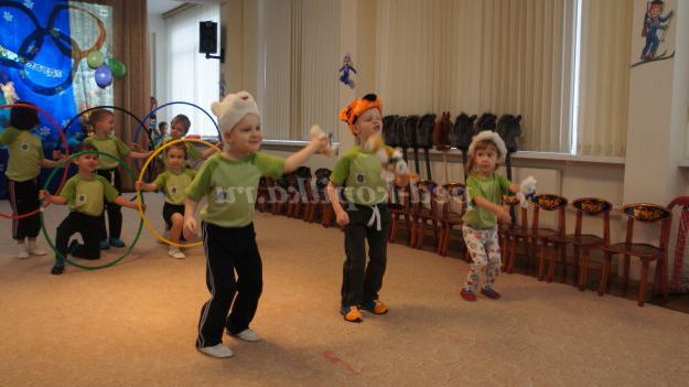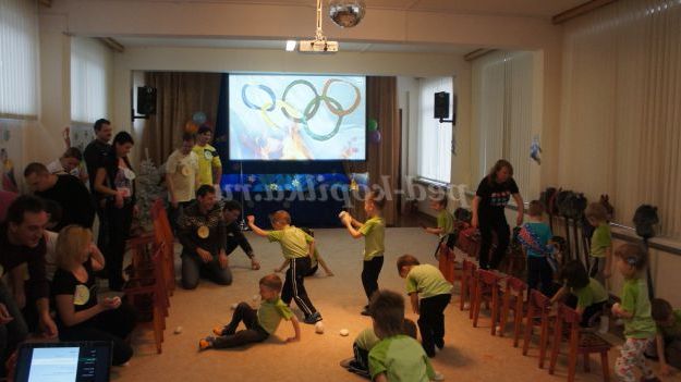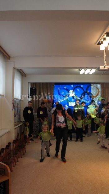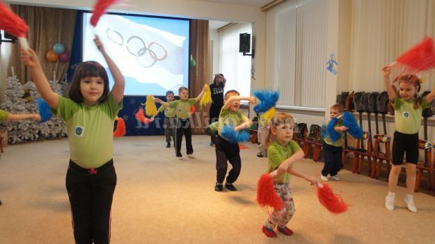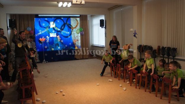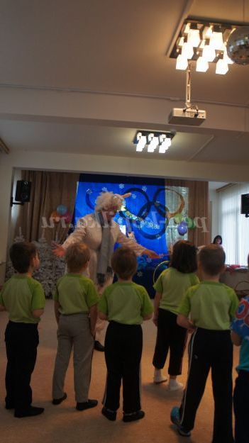 Під музику «Олімпійські кільця» діти вносять 5 олімпійських кілець, олімпійські символи, прапорці різних країн, прапори Росії, олімпійський факел. Дитина з олімпійським факелом «запалює» модель олімпійського вогню.