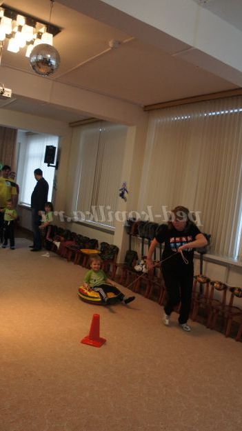Дитина сідає на санчата, батько за мотузку щастить санки навколо конуса, повертається назад і передає естафету наступному учаснику.
