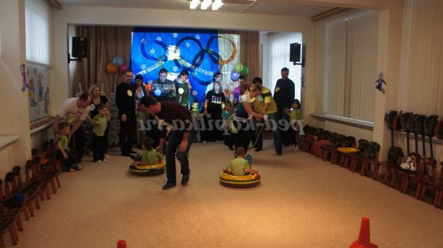 Розтяжка з прапором Росії і факелом «Олімпійські ігри», великі картинки зимових олімпійських видів спорту, ширма з сімейними газетами на тему «Олімпійські види спорту» (формат А3), модель олімпійського вогню.