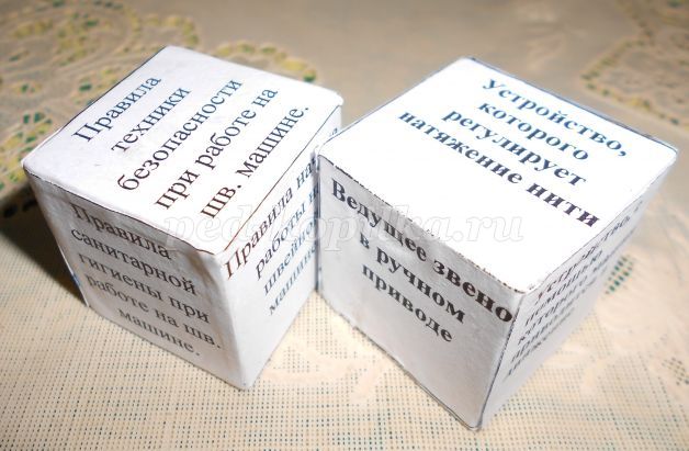 I. призначений для перевірки знань, що відносяться до однієї теми. На кожній грані кубика - питання або картинка деталі швейної машини.