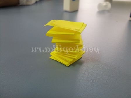 Взяти дві смужки кольорового паперу і скласти кінцями так, щоб краї збіглися. перегнути нижню смужку через верхню, щільно притиснути - так складати до кінця, вийде «змійка».