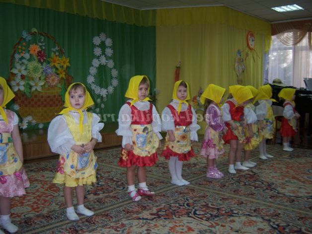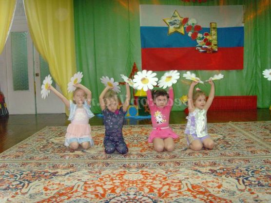 "Цветики, цветики, зберемо букетики. волошки, ромашки, рожеві кашки". Діти з різнокольоровими квітами бігають під музику. По закінченні музики збирають букети з однакових кольорів.