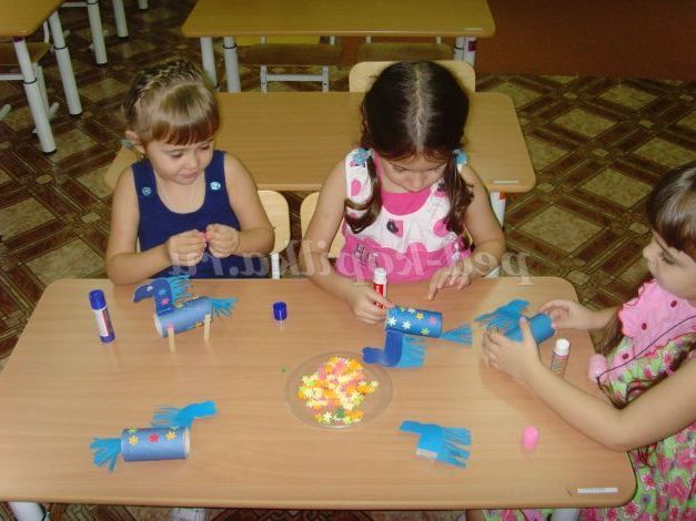 Діти самостійно розрізали гофрований папір для гриви і хвоста,обклеїли рулончик,приклеїли гриву до голови і прикрасили конячку(я допомогла дітям приклеїти ноги на гарячий клей)