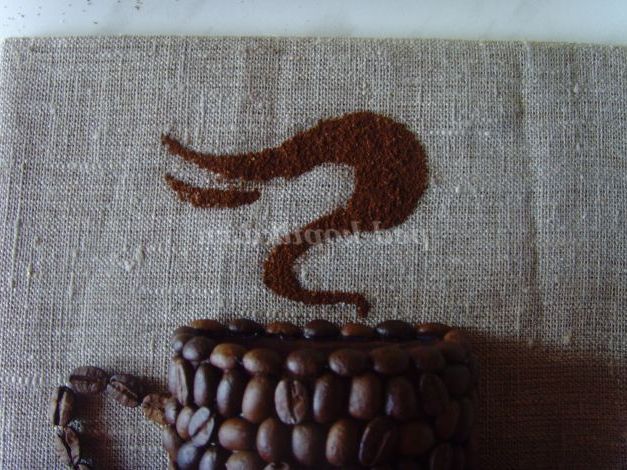 Необхідно вибрати однакові за розміром кавові зерна. Приклеюємо кави по краях кухля на гарячий клей. Звертаємо увагу, зерна приклеюємо рівно по заготівлі, щоб вони не виступали за межі гуртки, інакше не приклеїться до основи панно